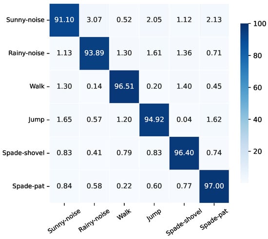 The model performs well under sunny conditions, but the NAR is high at 12.3%, possibly due to indistinct background noise characteristics on sunny days that make it difficult to differentiate. It performs even better under rainy conditions, with improved precision and recall, and a significantly reduced NAR of 5.2%, demonstrating its excellent adaptability and robustness to high-frequency noise. In recognizing specific activities such as walking and jumping, the model demonstrated exceptionally high accuracy. It performed particularly well in activities involving the use of a shovel, such as “Spade-shovel” and “Spade-pat”. Notably, the “Spade-pat” activity achieved the lowest false alarm rate of just 3.1% and the highest F1-Score of 97.05%, indicating the model’s high sensitivity and precision in identifying scenarios involving specific tool usage.