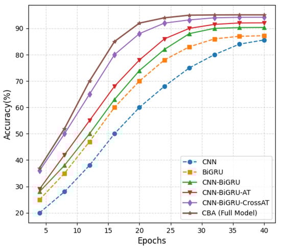 Firstly, according to the ablation study results, the standalone CNN and BiGRU models did not perform very well. Specifically, the CNN model achieved precision and recall of approximately 85%, with a high NAR of 14.2%, indicating its unsuitability for practical deployment. As the model structure evolved into a CNN-BiGRU integration, precision and recall improved to around 90%, and the NAR decreased to 9.6%. The further inclusion of the attention mechanism (CNN-BiGRU-AT) raised the precision and recall to about 92%. Most notably, the introduction of the cross-attention mechanism (CNN-BiGRU-CrossAT) resulted in the most significant performance improvement, with precision and recall reaching 94.20% and 93.70% respectively, and the NAR dropping to 6.8%. We conducted pairwise t-tests to evaluate the statistical significance of performance improvements across model variants. The results showed that the CBA model outperformed all other models with statistically significant differences in F1-score (). In particular, the performance gap was most pronounced when compared to the baseline CNN () and BiGRU (), indicating a substantial improvement over the basic models. As attention mechanisms were incrementally introduced, the F1-score increased from 90.12 (CNN-BiGRU) to 91.95 (CNN-BiGRU-AT, ), and then to 93.94 (CNN-BiGRU-CrossAT, ), and it finally reached 95.06 in the complete CBA model (). These results confirm that the inclusion of attention, especially cross-attention, plays a key role in enhancing the model’s ability to capture complex spatiotemporal features and significantly boosts its recognition performance.