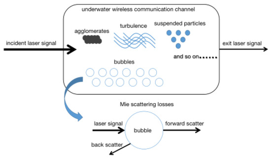 Multi-AUV cooperative systems require continuous underwater wireless optical communication (UWOC) to communicate instruction transmission, position confirmation, and other related information. However, the underwater environment is exceedingly complicated due to the existence of stochastic elements such as turbulence, pollutants, colloids, and so forth. There are three main factors that relate to the optical characteristics of the water environment—pure water, dissolved matter, and suspensions. A diagrammatic sketch of an UWOC environment is shown in Figure 1. There are two important optical properties of various components in water—the absorption and scattering of lasers. Lasers suffer from extreme absorption and Mie scattering in water or seawater. Blue–green wavelengths, as a distinct transmission window of the seawater for underwater optical wireless communication, also suffer from Mie scattering due to the water molecules, salt ions, phytoplankton, and other transparent biological organisms [18,19].