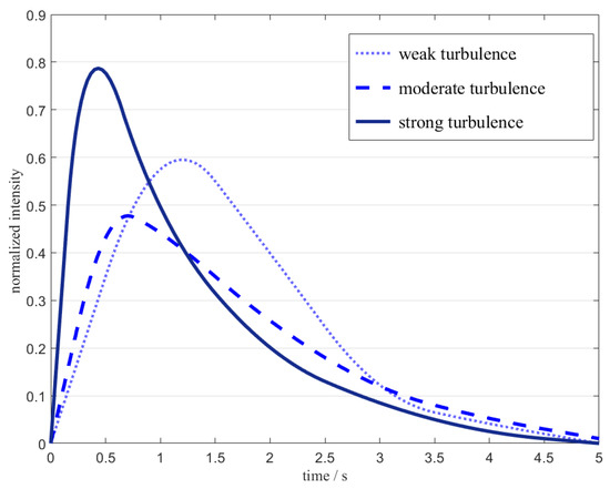 The GGD model was used to simulate underwater turbulence of different intensities; the results are shown in Figure 2. Finally, different scintillation coefficients are obtained, which are shown in Table 1. According to the findings, when there is a lot of turbulence in the water, the scintillation index is higher than 1. It is commonly accepted that there is moderate turbulence when the scintillation index is between 0.75 and 1, and weak turbulence is observed when the scintillation index is less than 0.75. We can classify underwater turbulence based on the results above, and we can use this to model how complicated underwater environments affect signals.