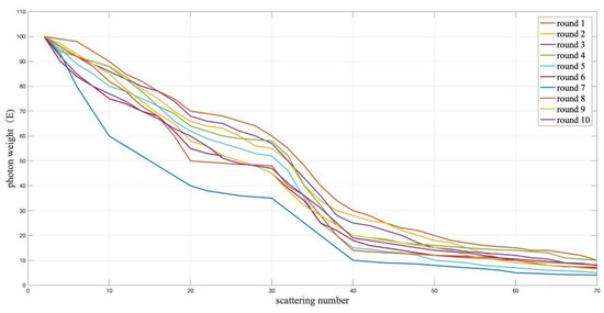 During the transmission of photons, the weights are attenuated by collisions with various impurities in water, and the photons carry the weights for the next scattering. We can regard the propagation process of UWOC as a Markov process, whereby each evolution of the attenuation and propagation process is not affected by the previous evolution. When photons are transmitted underwater, their interaction process also satisfies the Markov property [24], which can be used to directly superimpose the attenuation results. Many studies have demonstrated that the Markov-based statistical sampling method is effective for developing risk, performance, and other evaluation models [25,26,27]. In this study, the attenuation of wireless optical transmission underwater is simulated. At the same time, in order to better adapt to real-world communication environments, there are a small number of relatively agglomerated small molecular impurities in the transmission path, and the evolution of the attenuation and propagation process is not affected by the previous evolution. The wavelength of the blue–green laser is 532 nm. In order to observe the influence of the underwater environment on optical communication, we set the initial weight as 100, assuming that the photons will be scattered 70 times during the underwater transmission process. Meanwhile, the asymmetry factor g is 0.924 and σI2 is 0.86 [19]. Through 100 rounds of simulation tests, according to the remaining weight value of each laser at the end of transmission, we randomly selected ten of these process simulations; the attenuation diagram of the laser weight during each simulation is shown in Figure 3.