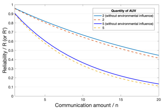Figure 4 shows a comparison of reliability between the ideal case and a case in which environmental factors are introduced. We assume that underwater environments are kept at a medium level to obtain the above data. It is not difficult to make out the influence of the model on reliability calculations. As the number of group communications increases, the reliability between the ideal situation and the real situation will gradually increase. The difference is caused by the influence of environmental factors on AUVs and group communications. The model proposed by this study is closer to that of the real application scenario, and the obtained data have a higher credibility and authenticity.