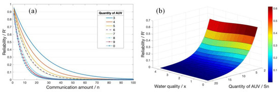 The relationship between system reliability, water quality, and quantity of AUVs. (a) The relationship between reliability and the number of communications. (b) The relationship between reliability, water quality, and quantity of AUVs.