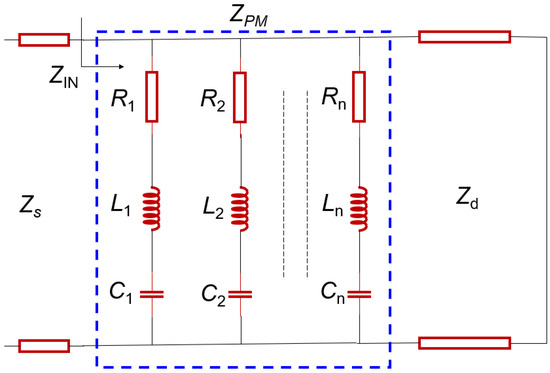 The plasmonic metasurface, as illustrated in Figure 1, can be described in terms of an equivalent circuit model based on the transmission line theory [35]. The plasmonic metasurface is represented by a combination of circuit elements connected together, as shown in the circuit diagram in Figure 2. The impedance of free space is represented by Zs. Subsequently, the circular structure is modeled by the RLC circuits. The dielectric substrate is represented by impedance Zd. Finally, the continuous copper layer on the backside of the dielectric layer is considered a short-circuit component in the circuit model [36].