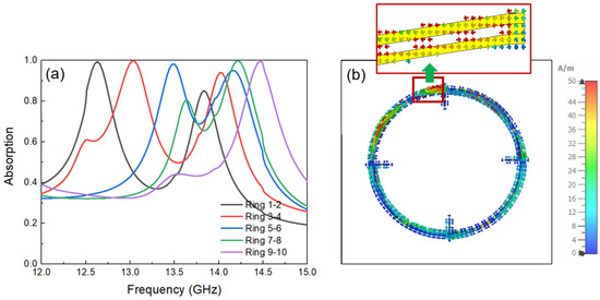 To further clarify the absorption characteristics of the plasmonic metasurface, we examined the response of the split-ring components within the structure. Figure 3a illustrates the absorption characteristics of the structure formed by pairs of adjacent split rings in the following order: Rings 1–2, 3–4, 5–6, 7–8, and 9–10, as depicted in Figure 1a. These paired split rings present the absorption spectra with two resonance peaks in a range of 12.30 to 14.80 GHz. At both end frequencies, a high absorption of over 95% is shown. The results indicate that, for the rings with smaller radii, the absorption peaks shift slightly toward higher frequencies, which can be explained by the fact that the total length of the split ring is shorter when the ring radius is smaller. It is noteworthy that the split-ring pairs can be formed not only by adjacent rings but also by any arbitrary pairing of rings. Consequently, a large number of coupled ring pairs can be generated. These coupled rings are capable of strongly absorbing EM waves across different frequency ranges. As a result, the plasmonic metasurface exhibits an overlap of multiple absorption peaks from various coupled ring pairs, leading to a broadband absorption spectrum.