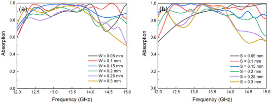 Comparison of the absorption of plasmonic metasurfaces with structural parameters L = 18.7, Rout = 7, and FR-4 thickness tsub = 3.2 mm. (a) S = 0.1 and W = 0.05–0.3 mm. (b) W = 0.1 and S = 0.05–0.3 mm.