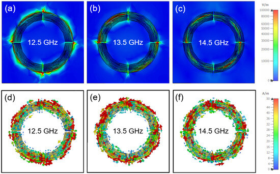 In addition to the E-field distributions, Figure 5e,f present the surface current distributions within the plasmonic metasurface at the same frequencies. These current distributions provide further insights into the physical mechanism that governs the broadband absorption. The regions exhibiting strong E-field intensities in Figure 5a–c are found to correspond to the areas with significant surface currents. Notably, the current distribution reveals that adjacent split rings form continuous current paths, resulting in a unique current flow pattern. Specifically, the currents in neighboring loops flow in opposite directions, developing localized magnetic dipoles that contribute to the absorption properties of the plasmonic metasurface. These opposite current directions are a direct consequence of the structural design with connecting bars.