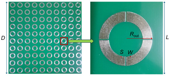 The proposed plasmonic metasurface, which was analyzed above, was fabricated as shown in Figure 6. The metasurface consisted of a 10 × 10 array of unit cells, as described here and in Figure 1, with the following parameters: D = 187 mm, L = 18.7 mm, Rout = 7 mm, W = 0.1 mm, and S = 0.1 mm. The plasmonic metasurface was fabricated by using the standard PCB technology on an FR-4 substrate with a thickness of 3.2 mm. The copper layers on both the top and bottom surfaces of the structure had a thickness of 0.035 mm and conductivity of 5.96 × 107 S/m. FR-4 is a highly durable material resistant to environmental factors such as mechanical, temperature, and chemical factors, while the copper layer, manufactured by using the standard PCB technology, exhibits excellent adhesion to the FR-4 substrate. This method is widely employed in the fabrication of electronic circuits and antennas owing to its high durability [38]. The structure comprised only three layers, and with the dimensions of the unit cell as specified above, it was relatively straightforward to fabricate. This simplicity is one of the advantages of the proposed plasmonic metasurface by utilizing the SSPP effect, compared to multilayered or 3D structures commonly employed in MPA designs. The overall size of the fabricated plasmonic metasurface was 187 × 187 mm. The detailed geometrical parameters of the proposed plasmonic metasurface are presented in Table 1.