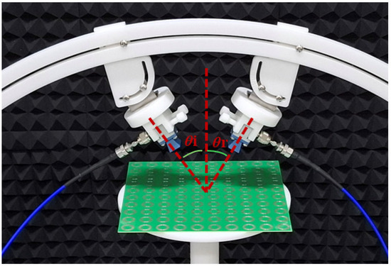 The plasmonic metasurface was characterized by using a Rohde & Schwarz ZNB20 Vector Network Analyzer (VNA) and a pair of wideband antennas operating in a frequency range of 12 to 18 GHz, as shown in Figure 7. The two antennas were connected to the two ports of the VNA, enabling the transmission of EM waves toward the structure and the reception of reflected waves. After the calibration process of the VNA, the reflection coefficient (S11) of the plasmonic metasurface was determined through the transmission coefficient (S21) from the transmitting antenna to the receiving one. Since the back side of the structure consisted of a continuous copper layer, EM waves could not transmit through the structure, and the absorption of the plasmonic metasurface was calculated by employing formula A = 1 − |S11|2. To measure the incident angle dependence of the plasmonic metasurface, the two antennas were rotated and moved along an arc-shaped support, ensuring that the incident angle θi equals the reflection angle θr.