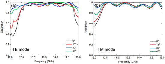 Figure 8a presents the measured absorption performance of the plasmonic metasurface for the TE-polarized waves at incidence angles ranging from 0 to 45°. The results demonstrate that the plasmonic metasurface realized an absorption over 90% of the incident wave within a frequency range of 12.40 to 14.75 GHz. At larger incidence angles, the absorption bandwidth becomes broader (e.g., 12.10 to 14.90 GHz at 45°) compared to smaller incidence angles. This could be attributed to the parallel component of the EM waves interacting with the plasmonic metasurface in a manner similar to 3D structures, where metal bars aligned with the direction of the incident EM wave contributed to the absorption. When compared to the absorption spectrum obtained from simulations, the measured values exhibit some discrepancies. However, the broadband absorption characteristic and high absorption exceeding 90% of the plasmonic metasurface are still preserved. The observed differences might stem from the fabrication process of the plasmonic metasurface, since small fabrication errors can influence the interactions between the split rings in the unit cell structure. Nevertheless, these interactions might compensate for each other, ensuring that the quality of the absorption spectrum of the plasmonic metasurface is not significantly affected. Moreover, the discrepancies might also derive from the measurement process, since we used a VNA to measure the reflection coefficient (S11) of the plasmonic metasurface, from which the absorption performance was calculated. The antennas might have been placed at slightly misaligned positions, and certain unavoidable unwanted interactions could also contribute to these differences.