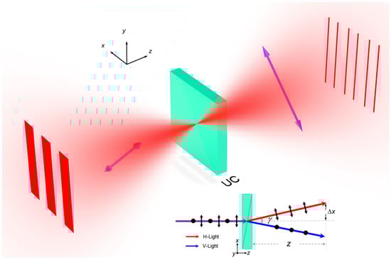 where is the unit vector in the anti-diagonal direction. From Equations (2) and (4), one can see that the polarization component undergoes splitting through the uniaxial crystal. Additionally, the action of the orthogonal polarizer causes destructive interference in the output field.