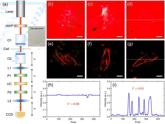 In biomedical imaging, some tissues and cells often have low contrast when directly imaged due to weak scattering and absorption. Next, we demonstrate that optical spatial differentiation using uniaxial crystals can also achieve dark-field differential imaging of transparent cells. The experimental setup, shown in Figure 5a, simply added a confocal microscopy system at the position indicated by the dashed box in Figure 2a. The objective lens parameters used were a magnification of and a numerical aperture of . We selected unstained paramecium cells, and their bright-field images are shown in Figure 5b–d. One can see that the cell morphology was difficult to distinguish or even invisible in a bright field. In dark-field differential imaging, the contours of cells were clearly visible and had high contrast, as shown in Figure 5e–g. Not only the edge of the cell, but also the nucleus and other organelles inside can be clearly distinguished, which is very difficult in a bright field. Figure 5h,i show the cross-sectional intensity distribution along the dashed lines in Figure 5d,g, providing a more intuitive demonstration of the advantages of dark-field differential imaging.