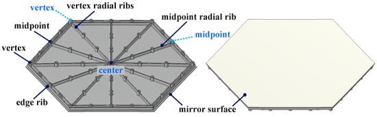Schematic diagram of the segmented mirror’s key parameters. (The key parameters of the segmented mirror are defined as follows: The six vertices of the segmented mirror are defined as “vertex”, the centers of the six edges of the segmented mirror are defined as “midpoint”, and the center of the mirror surface is defined as “center”. The radial ribs extending from the center to the midpoints are defined as “midpoint radial ribs”, totaling six. The radial ribs extending from the center to the vertices are defined as “vertex radial ribs”, also totaling six).