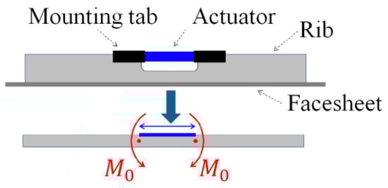 Based on the equivalent principle of the piezoelectric effect, the piezoelectric actuator is regarded as a pure force actuator and is embedded within the back of the mirror substrate material [20,21,22,23,24], creating an equivalent bimetallic layer effect, as detailed in Figure 3.