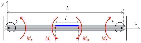 Schematic diagram of a simply supported beam with a rotational spring. (Red arrows indicate bending moments, red dots signify the effective beam ends of the simplified beam, blue arrows represent the actuator extension illustration, and blue lines indicate the actuator layout positions).