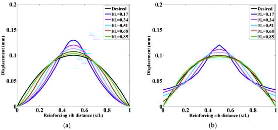 In this study, actuators were strategically placed on the stiffeners to verify the correlation between the deflection curve of a simply supported beam and the finite-element simulation results. The specific parameter settings are detailed in Table 1, and the analysis results are presented in Figure 5.