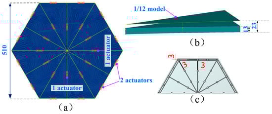As telescope apertures increase, traditional adjustment methods can no longer meet the high-precision wavefront aberration correction requirements [18,19]. Embedding surface actuators on the back of segmented mirrors not only achieves a lightweight design but also the high integration of active control, which is an important method to match the current high-precision curvature adjustment and surface correction needs. This paper adopts a parametric modeling method to study the design method of a large-scale curvature-adjustable optical mirror; the relevant parameters of the optical mirror are illustrated in Figure 1. By optimizing the physical parameters on the back of segmented mirrors through iterative optimization, a parametric model of a segmented mirror with a radius of curvature 9100 mm is established. From simulation and experimental perspectives, the design goal of a wide range of curvature radius adjustability is achieved, providing a larger adjustment range for the reconfiguration of large-aperture segmented optical systems, which has practical guidance value.