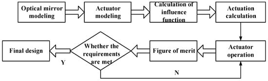By utilizing a given parametric function file which encompasses descriptions of segmented mirror geometry, actuator layout, mesh density, and other parameter information, the required finite-element model is created, and the surface shape diagram is calculated. Users can alter parameters to obtain the optimal design outcome, iterating towards the most favorable output surface shape. The essence of iteration lies in the computation of the influence function, which represents the mapping of the reflective mirror surface shape under the actuation of a single actuator. That is, given a set of displacements, the corresponding actuator commands can be obtained using the least-squares method to accomplish the control of the surface shape. The parametric modeling process is depicted in Figure 2.