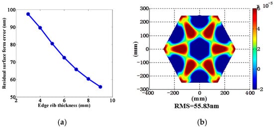Optimization results of edge ribs: (a) residual surface error curve after optimization; (b) residual surface error plot for 9 mm edge ribs.
