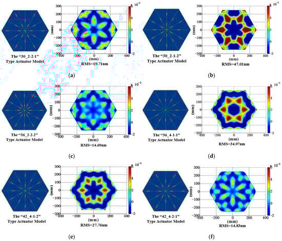 Parametric modeling and residual surface error analysis of segmented mirrors. The symbols (a–p) denote distinct configurations of varying numbers of actuators, each associated with a specific parametric model and residual surface error profile.