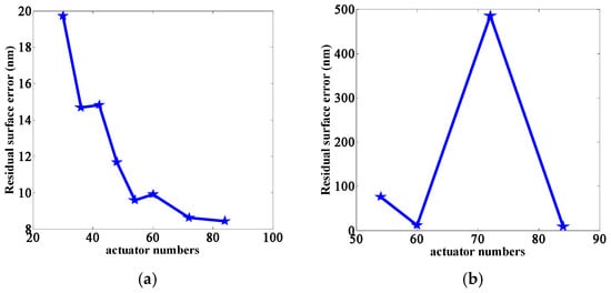 Following the analysis presented, we selected the optimal residual surface error for each actuator configuration and depicted its trend using curves, as illustrated in Figure 10a. It is evident from the figure that there is a generally inverse relationship between residual surface error and the number of actuators. When the number of actuators exceeds 54, the trend of the curve becomes less pronounced. Consequently, we chose the latter four configurations for further optimization. Considering the practicality of engineering implementation, we modified the surface on which the actuators were located to a plane. The resulting changes in residual surface error for these four schemes are presented in Figure 10b.