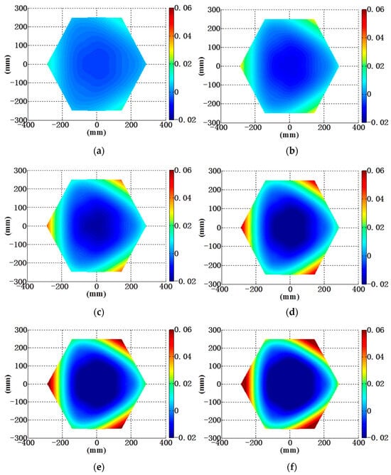 Variation in curvature radius under six operational conditions: (a) dROC = −29.78 mm; (b) dROC = −60.27 mm; (c) dROC = −88.92 mm; (d) dROC = −119.75 mm; (e) dROC = −147.29 mm; and (f) dROC = −178.45 mm.
