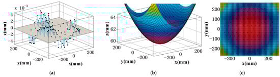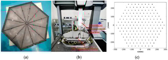 The experimental procedure involved the use of a coordinate measurement machine (CMM) to conduct curvature radius tests on the segmented mirror. The actuators mounted on the back of the segmented mirror were of the Coremorrow PSt150/7/20 VS12 model, with a nominal voltage range of 0–150 V and a nominal stroke of 19 μm. During testing, the optical axis of the segmented mirror was vertically positioned and secured to the test bench using three bipod mounts. To enhance the reliability of the test outcomes, a multimeter was employed to verify the zero-voltage level of 60 piezoelectric actuators prior to electrical activation, thereby completing the calibration procedure. Subsequently, 185 measurement points were uniformly selected across the surface of the segmented mirror for data acquisition. During this process, the tri-axial coordinate-measuring instrument’s probe initiated at a vertex on the edge of the segmented mirror and executed reciprocating movements parallel to the mirror’s edge. Owing to the hysteresis effect inherent in piezoelectric ceramics, measurements were conducted 30 s after each electrical application. This protocol was followed to ensure that the data collection was comprehensive and accurate; the product and measurement point selection are depicted in Figure 14b,c.