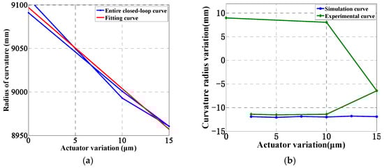 Figure 16 reveals that the curvature radius exhibits a total variation of 146.89 mm across the entire testing range, demonstrating an approximate linear change, which satisfies the requirement for a wide-range adjustment of the curvature radius. Within the 0–10 μm variation interval, the adjustment of the curvature radius is significant and closely matches the simulation results. From 10 μm to the full closed-loop stroke of 15 μm, the optical mirror accurately reflects the true bending conditions, indicating a reduction in the adjustment of the curvature radius per unit stroke. This decrease is primarily attributed to the increased bending moment in the peripheral region of the segmented mirror as the actuator adjustments increase, which, in turn, reduces the bending contribution to the segmented mirror. This observation aligns with the actual stress conditions encountered. Analyzing the entire closed-loop curve trend, the curvature radius changes are approximately symmetrically distributed within the ±10 mm range. The discrepancies between the experimental and simulated results are initially attributed to mechanical assembly errors, stress relief, and hysteresis and degradation of piezoelectric ceramic actuators, posing higher demands on the subsequent design and assembly of high-precision segmented mirror structures.