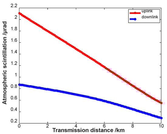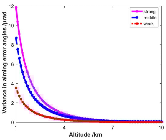 where C r is the scintillation constant; λ and ω 0 are the wavelength and girdle radius of the laser beam, respectively; and r 0 is the atmospheric coherence length. In Figure 2, we can see that the variance in aiming error angle of the uplink caused by light intensity scintillation changes with altitude, and the higher the altitude, the smaller the aiming deviation caused by light intensity scintillation; the closer it is to sea level, the more obvious the effect of atmospheric turbulence on the beam; with an increase in altitude, the atmosphere gradually becomes thinner, caused by turbulence changes in the refractive index of the atmosphere becoming smaller; therefore, the aiming angle caused by the change is also smaller.