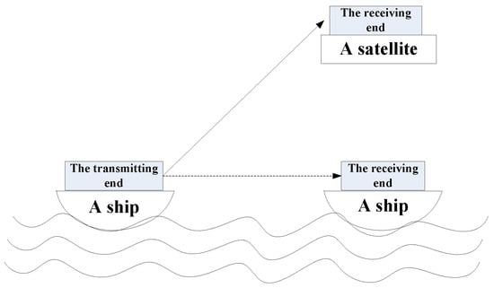In a ship-based QKD system based on the BB84 protocol, performance is affected by sea-surface atmospheric turbulence. Moreover, the downlink is expected to experience lower attenuation since the uplink beam is much more affected by atmospheric turbulence [5,18]. If the uplink can accomplish communication, the downlink can also realize communication. Therefore, this study focuses on the performances of the uplink of a ship-based QKD system. Two kinds of ship-based QKD systems are studied in this paper: one where transmitter is on a ship and the receiver is on a satellite, and one where; both the transmitter and receiver are on ships. The specific schematic diagram is in Figure 3 as follows:
