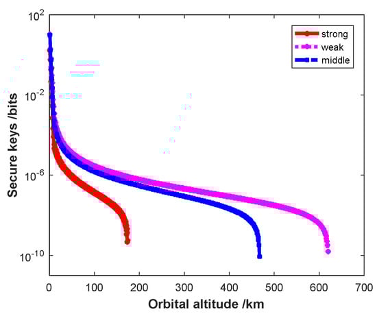 The relationship between secure keys and satellite orbital altitude for different intensities of turbulence is shown in Figure 5. These curves show that under weak turbulence conditions (Cn2 = 10−17), the system can communicate with satellites at an orbital altitude of 619 km; under middle-intensity turbulence conditions (Cn2 = 10−15), the system can communicate with satellites at an orbital altitude of 466 km; and under strong turbulence conditions (Cn2 = 10−13), the system can communicate with satellites at an orbital altitude of 173 km. From these data, it can be seen that the communication distance between the offshore platform and the satellite QKD system decreases with an increase in turbulence intensity due to the influence of sea-surface atmospheric turbulence.