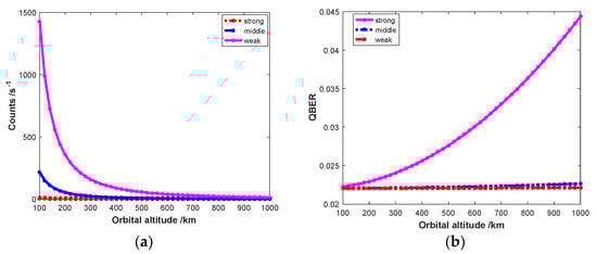Based on the above results, the system was optimized to ensure that the transmitting end could communicate with the receiving end on a satellite at an orbital altitude of 1000 km. Figure 6a shows the diagram of photons counts received versus satellite orbit altitude when the zenith angle is 15 degrees, Figure 6b shows a diagram of quantum BER (QBER) versus satellite orbit altitude for different turbulence intensities. It can be seen that the performances are seriously affected by strong turbulence. In strong turbulence, the photon counts are significantly lower, and the QBER performance significantly increases.