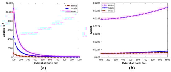 Figure 7. Photon counts (a) and QBER (b) versus satellite orbital altitude at a 15° zenith angle.