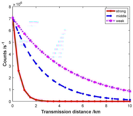 In a ship-to-ship QKD system, the transmitter is fixed on a ship, and the receiver is fixed on another ship. Figure 8 shows a diagram of secure keys versus transmission distance under different intensity turbulence conditions. The transmission distances of the system are 32 km, 16 km, and 3 km under a weak turbulence, middle turbulence, and strong turbulence atmospheres, respectively. It can be seen that the performance of QKD is seriously affected by the atmospheric turbulence when it is transmitted horizontally at the sea surface, which leads to a sharp decrease in the QKD transmittable distance and secure keys with an increase in turbulence intensity.