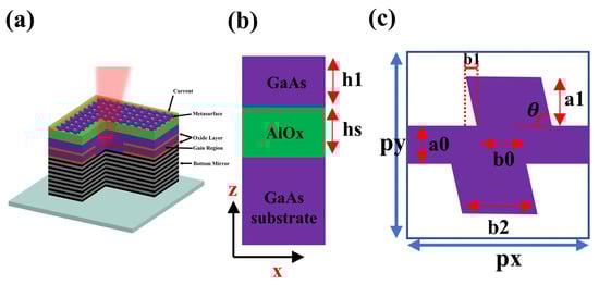Here, is the threshold gain coefficient, and when it is exceeded by the gain coefficient, the laser is able to produce a continuously stabilized laser output. L is the equivalent optical cavity length of the VCSEL. is the overall loss, including the mirror loss and internal loss. and correspond to the reflectivity of the top and bottom mirrors in VCSEL, respectively. It can be derived from Equation (1) that the top chiral metasurface in a circularly polarized VCSEL that can excite LCP light should have to satisfy two basic conditions. The first one is that the reflectivity of the metasurface to the LCP should be greater than 99% [11], which can make the threshold gain coefficient of the laser to be controlled to a tiny amount, and the second one is that the metasurface should have a certain circular dichroism, which can ensure that only the LCP is generated and the RCP is not excited. In addition, the chiral metasurface in the laser requires only a simple mirror symmetry operation to replace the excitation beam from LCP to RCP. Figure 1a illustrates the 3D structural diagram of a circularly polarized VCSEL with the top mirror as a chiral metasurface, and the components of the whole VCSEL from the bottom to the top are, in order, the substrate, the N-doped DBRs, the gain region, the confinement layer, and the chiral metasurface. Figure 1b shows the XZ cross-section of the chiral metasurface, which can be used to characterize the material component distribution as well as the thickness information of the optical film. As shown in Figure 1c, the top view of the chiral metasurface details the geometrical composition of the unit cell, which focuses on the dislocation phenomenon of two parallelograms.
