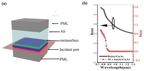 (a) The optical simulation model decomposition diagram based on the finite element algorithm. (b) The refractive index of the GaAs in the wavelength range of 0.7 µm to 1.3 µm. The black arrow pointing to the left indicates that the vertical axis of the corresponding curve is on the left.