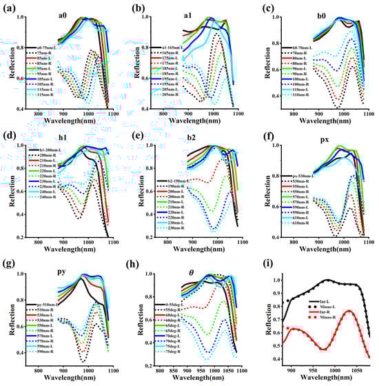 The scaling effects of geometric parameters in chiral metasurface. (a–h): The influence of geometrical dimensions a0, a1, b0, h1, b2, px, py and on the spectral properties of metasurfaces. (i): The reflection spectrum of the optimized metasurface. The titles of the subplots correspond to the metasurface parameters. L and R in the legend, respectively, correspond to the cases where the incident light is LCP and RCP. Additionally, dashed lines and solid lines, respectively, correspond to RCP and LCP.