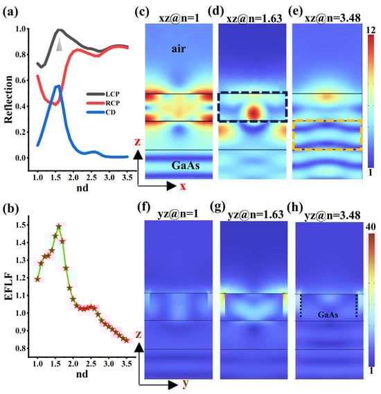 (a) The effect of refractive index changes in the surrounding medium on chiral reflective microdevices. (b) EFLF of the chiral metasurface for different refractive index cases. The metasurface corresponding to (b) is the optimized version, and when analyzing the substrate refractive index nd, the hs remains unchanged. (c–h) Electric field distributions on the chiral metasurface in some refractive index cases. The black dashed box is the boundary of the GaAs material in the metasurface and the orange dashed box is the boundary of the low-refractive material.