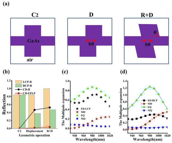 While the previous paragraph explored high reflectivity by analyzing the parameter of the refractive index contrast, this paragraph focuses more on investigating the optimization of the CD value. The chiral periodic array can generally be categorized into the 3D optical chiral and 2D optical chiral based on the mirror symmetry of the structure. Among them, the 2D optical chiral response refers to the case where the in-plane mirror symmetry is broken, in which the geometrical and material parameters of the chiral unit are just enough to couple with the incident CP photons, and thus, intrinsic chiral resonance occurs, realizing a highly controllable modulation of the circularly polarized photons. Figure 5a demonstrates the patterns of the unit cell of the metasurface with the C2 symmetry, after the displacement operation, and after double operation of the displacement and rotation, respectively, which clearly demonstrate the whole process of structural symmetry breaking, which refers to the process from zero chirality to large CD. Figure 5b illustrates the histograms of the reflection corresponding to the three unit-cell structures in Figure 5a. It is clear that both the reflectivity and the CD value of the LCP increase step by step, and the displacement operation and the rotation operation tend to modulate the CD value and the reflectivity, respectively. The size order of the EFLF under different operations remains consistent with that of the CD, and it seems to suggest that the near-field analysis of the metasurface may help to uncover the physical origin of the high CD phenomenon.