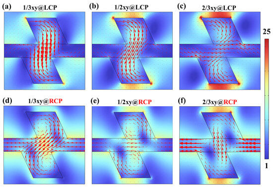Near-field profiles on xy cross-sections of the chiral metasurface at different heights at the 980 nm operating wavelength. The “1/3”, “1/2”, and “2/3” above the picture respectively represent the cross-sections at 1/3, 1/2, and 2/3 of the thickness of the metasurface. (a–c): The case of LCP incidence. (d–f): The case of RCP incidence. The red arrow represents the direction of the equivalent current.