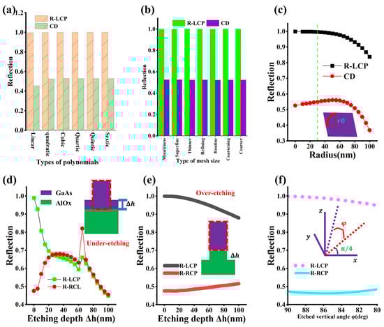 This chapter primarily investigates the impact of potential errors introduced in the model and fabrication process on chiral metasurfaces. A superior optical simulation model ought to exhibit distinct convergence with regard to the polynomial components and mesh size within the finite element algorithm. Furthermore, the minimum geometrical size of the chiral metasurface is 90 nm for b0, and such minuscule lines necessitate realization through the electron beam lithography (EBL). EBL is a technique that employs a focused electron beam to pattern a substrate coated with photoresist. By means of EBL, the pattern in Figure 1c can be transferred onto the photoresist, and subsequently, dry etching is utilized to ultimately etch the chiral pattern onto the GaAs material. During the fabrication procedure, common etching manifestations such as etching fillets, etching tilt angles, over-etching, and under-etching arise due to diffraction stray light in lithography and non-zero isotropic etching components. Electromagnetic finite element algorithms can generally be categorized into several steps: derivation of the integral form of partial differential equations, discretization of the solution domain, selection of local processing units, assembly of the overall matrix, imposition of boundary conditions, and numerical solution of the matrix. Among them, in the local processing unit step, it is requisite to solve each element in the local matrix by employing the algebraic approach based on the distinct shape functions selected, which are typically polynomial functions. Figure 7a depicts the impact of diverse types of shape functions on the metasurface. The order of the polynomial is nearly independent of the reflectivity. When the order of the polynomial is greater than or equal to 2, the CD remains essentially unchanged. Furthermore, in the COMSOL software, the common options for mesh size typically encompass “coarser”, “coarsening”, “routine”, “refining”, “thinner”, “super-fine”, and “minuteness”. As illustrated in Figure 7b, the reflectivity and CD scarcely vary with the mesh size, which constitutes a robust validation for the correctness of the simulation outcomes. Figure 7c exhibits the influence of the radius of the etched fillet on the metasurface. The reflectivity of LCP declines as the radius of the fillet increases, while the CD initially increases and subsequently decreases. When the radius of the fillet is 30 nm, the reflectivity of LCP has already decreased to 99%. Figure 7d,e present the influence of the etching depth error . The red dashed-line frame in the inset corresponds to the ideal GaAs etching depth. For the over-etching phenomenon in Figure 7d, the performance of the chiral metasurface deteriorates significantly. When is 20 nm, the microstructure nearly loses its chirality. For the under-etching phenomenon in Figure 7e, the chirality decays gradually with the increase in . When is 100 nm, the CD is approximately 40%. Based on the data feedback in Figure 7d,e, when formally fabricating chiral metasurfaces, it is imperative to ensure that the etching type is under-etching initially. Secondly, a considerable number of dummy wafer processes should be conducted beforehand to explore the precise dry etching conditions, such as etching power, etching time, etching gas ratio, and the type of inert gas. Figure 7f indicates that the influence of the etching vertical angle on the chiral metasurface is also marginal.