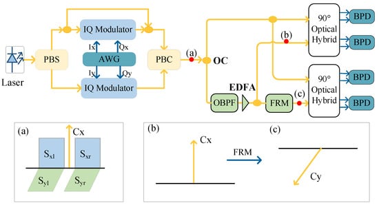 At the receiver, due to the PMD in the fiber, both the signal and the carrier undergo random rotations in their SOP. The use of a PBS can lead to polarization fading, which degrades the quality of signal transmission traditionally. The signal is split into two paths by OC: one path is directly injected into the hybrid, while the other path utilizes an OBPF to extract the carrier, as shown in Figure 1. Subsequently, a pair of orthogonal carriers can be constructed using FRM. The FRM transforms any input polarization state into an orthogonal output polarization state []. During transmission, the SOP of the signal undergoes random rotations; however, even if the polarization state is unknown, the orthogonality between the two signals remains unchanged throughout the transmission process. The polarization states of the signal and the carrier consistently remain aligned. As a result, the orthogonal optical carriers, when demodulated through a receiver (as shown in Figure 1), enable the recovery of the received signal and the restoration of the optical field information.