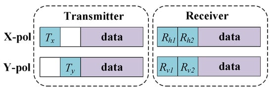 During signal transmission, there is polarization crosstalk between the two polarization directions in the fiber link. Since the received OFDM signals are the polarization mixing of two transmitted OFDM signals with various SOP in the PDM-OFDM fiber link, channel estimation is necessary for polarization demultiplexing and signal demodulation. Each subcarrier is a subchannel in the OFDM system. The PDM fiber link can be dealt with as the two-input–two-output (2 × 2) channel model, where the Jones matrix , consisting of and , can be generally expressed as: