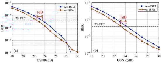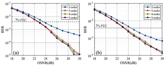 In the description of the second section, extracting the optical carrier using an OBPF is a crucial step for achieving field recovery of the optical signal. To better align with practical scenarios, Gaussian filters of different orders are employed to simulate the OBPF. Figure 5 displays the system performance at different OSNR for back-to-back transmission under the optimal CSPR, with the Gaussian filter orders set to 2, 3, 4, and 5, respectively. When the filter order increases from 2 to 3, the system’s BER performance improves significantly. As the filter order increases, it effectively separates the signal and the carrier. When the filter order is further increased to 4, at an OSNR of 23 dB, the system’s BER is below the HD-FEC threshold of 3.8 × 10−3, enabling error-free transmission. Continuing to increase the filter order does not result in noticeable further improvement in the BER. Therefore, the OBPF order is set to 4, which will be used for the next simulations.