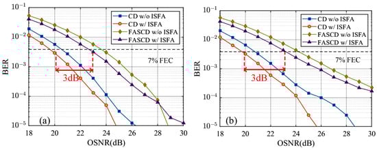 BER versus OSNR for PDM-OFDM FASCD (a) at BTB and (b) after 320 fiber transmission.