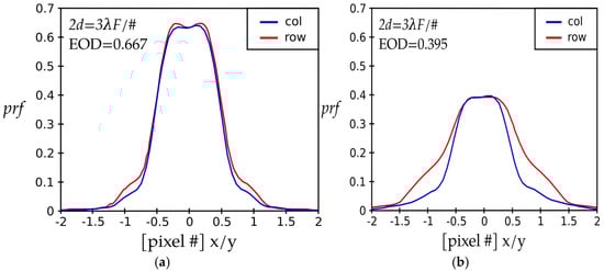 Instrument point response function prf, corresponding to select points, I and F, in Figure 3, as a function of two orthogonal directions, x and y, or rows and columns, for the case of a lens with an asymmetrical central obscuration and with a mixture of aberrations (a40:a31:a22 = 1:0.25:0.25) for a detector pixel size of 2d = 3λF/#. EOD decreases with an increase in the amount of aberration. (a) Point I. (b) Point F.