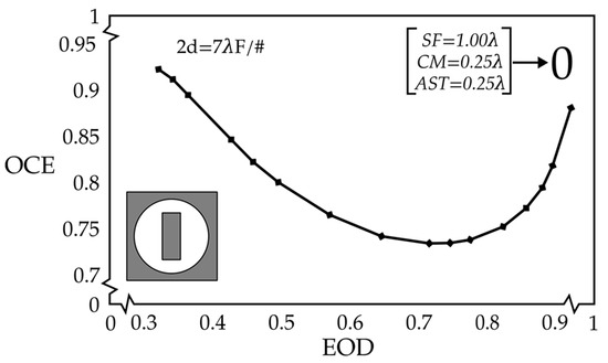 The psf of a simple lens, with a central rectangular obscuration suffers deterioration from several contributions as follows: (i) spherical aberration tends to rapidly move energy out of the central core to the side lobes with an increase in wavefront error, as illustrated in Figure A1a (see Figure 1 of Ref. [7]); (ii) coma features a centroid deviation from the chief ray that extends the psf in a specific manner, as it can be observed in Figure A1b (Figure 5 of Ref. [7]), resulting in a drastic drop in OCE with just a small decrease in EOD; (iii) astigmatism simply blurs the psf, as demonstrated in Figure A1c (see Figure 7 of Ref. [7]); and finally, (iv) the rectangular central obscuration diffracts an additional amount of energy to the side lobes, slightly reducing the size of the central core; this results in OCE featuring a dramatic peak in Figure A1d (see Figure 9 of Ref. [6]).