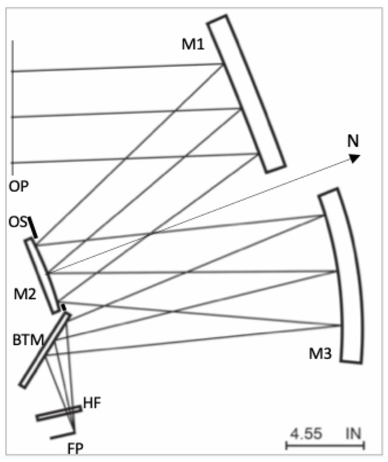 Optical layout of the reflective three-mirror (RTM), with a beam for a single edge point being traced. The optical axis, normal to the secondary mirror, M2, is indicated by N. The optical stop, OS, is located at the second mirror, M2. The beam-turning mirror, BTM, shortens the overall length of the instrument. Other annotations: OP—object plane; M1—mirror 1; M3—mirror 3; HF—holographic filter; and FP—focal plane.