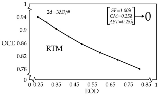 The OCE vs. EOD results for the RTM are presented in Figure 7 and Figure 8 for two detector pixel sizes, 2d = 3λF/# and 2d = 7λF/#, respectively. An interesting trend can be observed in Figure 7 for the smaller, 2d = 3λF/#, detector pixel size. It appears that a linear correlation exists between OCE and EOD with a slope of −0.29. The curve OCE vs. EOD in Figure 3 for a single lens with central obscuration and a small pixel size also features a negative slope; however, it deviates from linearity more than the one in Figure 7.