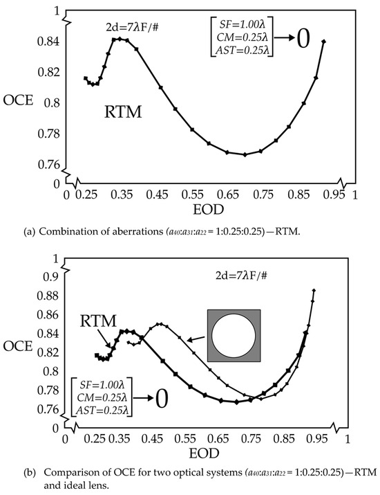 The graph of Figure 2a, overlaid with the graph OCE vs. EOD for spherical aberration equal to 1.25λ from Figure 3, Ref. [7], is displayed in part (b). The heavy solid line is the imported one. The downward trend of OCE for small EOD values seems to stabilize for the highest aberration values when mixed. The previously studied case of spherical aberration indicates a steep increase in OCE with a decrease in aberration for small EOD values. Stabilization arises consequent to the contribution of the small amount of coma and astigmatism for the maximum wavefront error.
